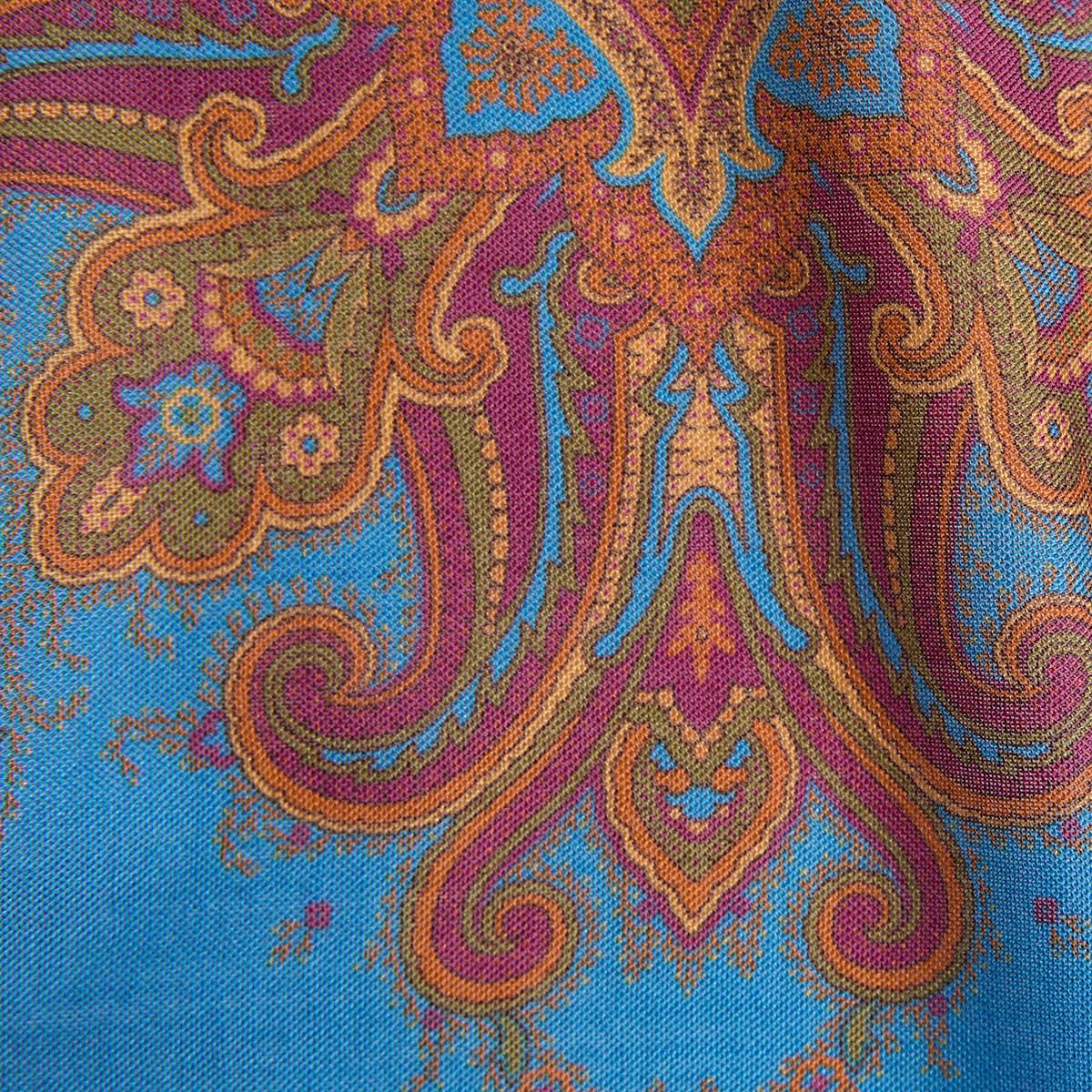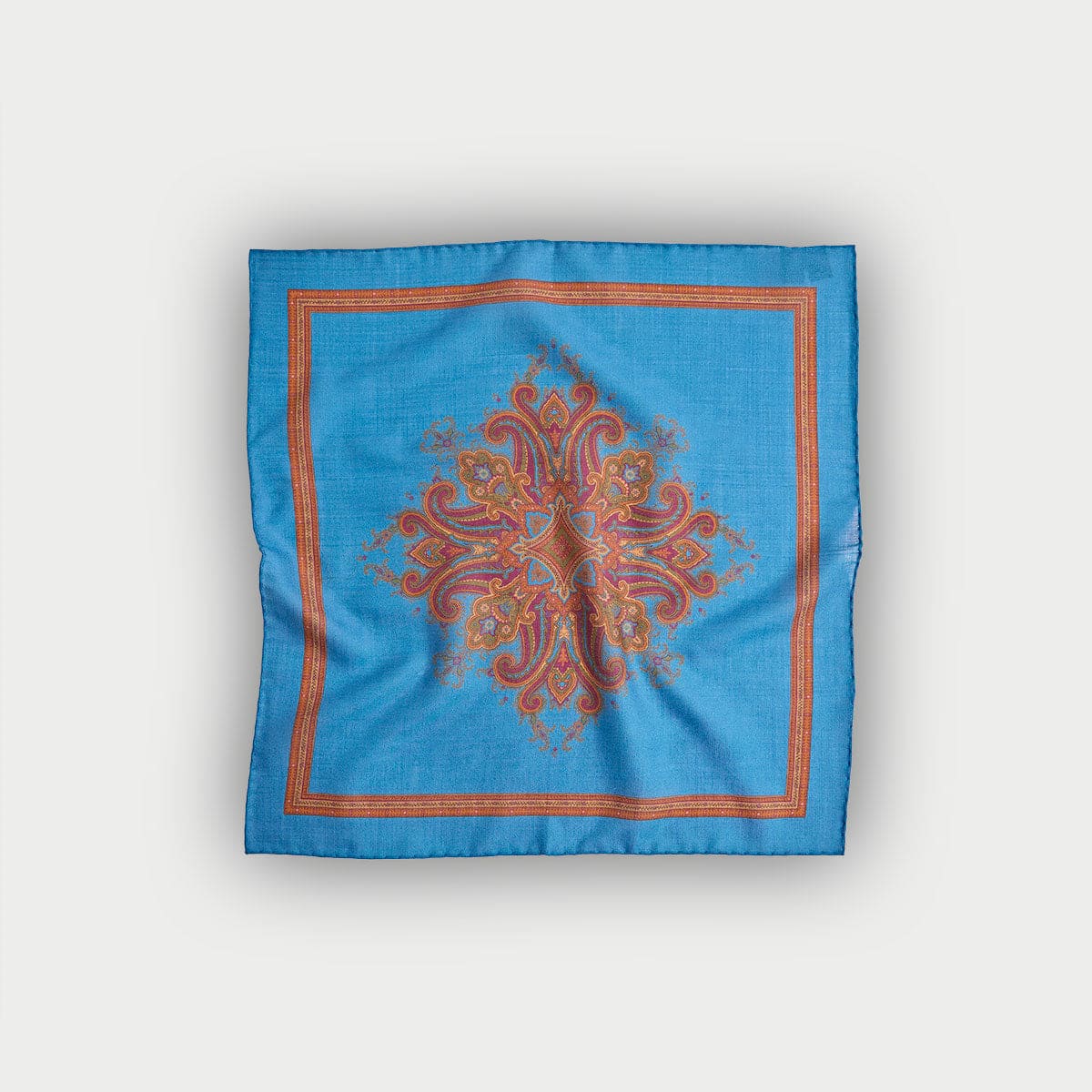 This pocket square features a rich blue background with a striking central paisley cross motif. Crafted from a silk blend, it offers a smooth texture and a subtle sheen. The hand-rolled edges highlight the quality craftsmanship, and it is proudly made in England. Perfect for adding a touch of classic style to your outfit.