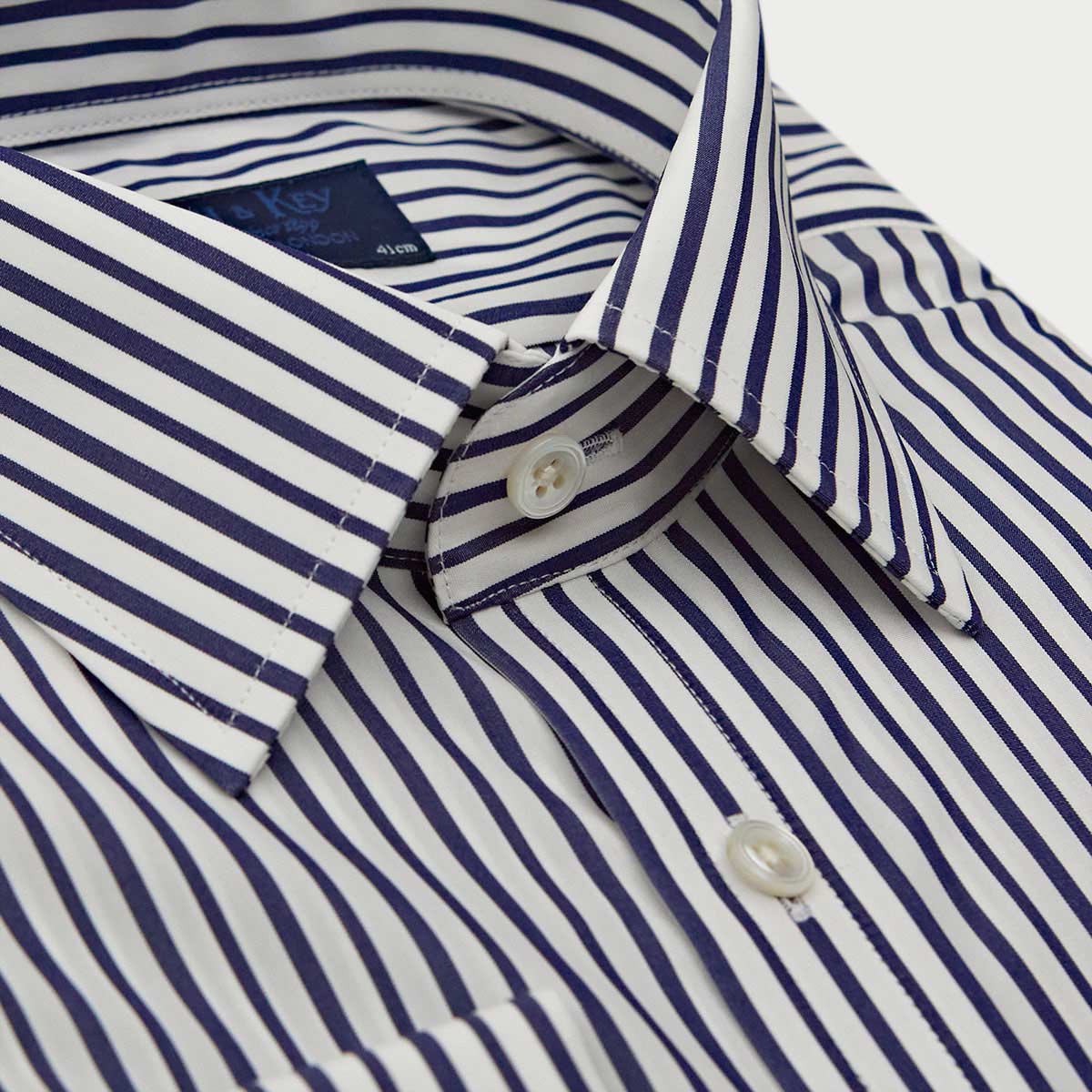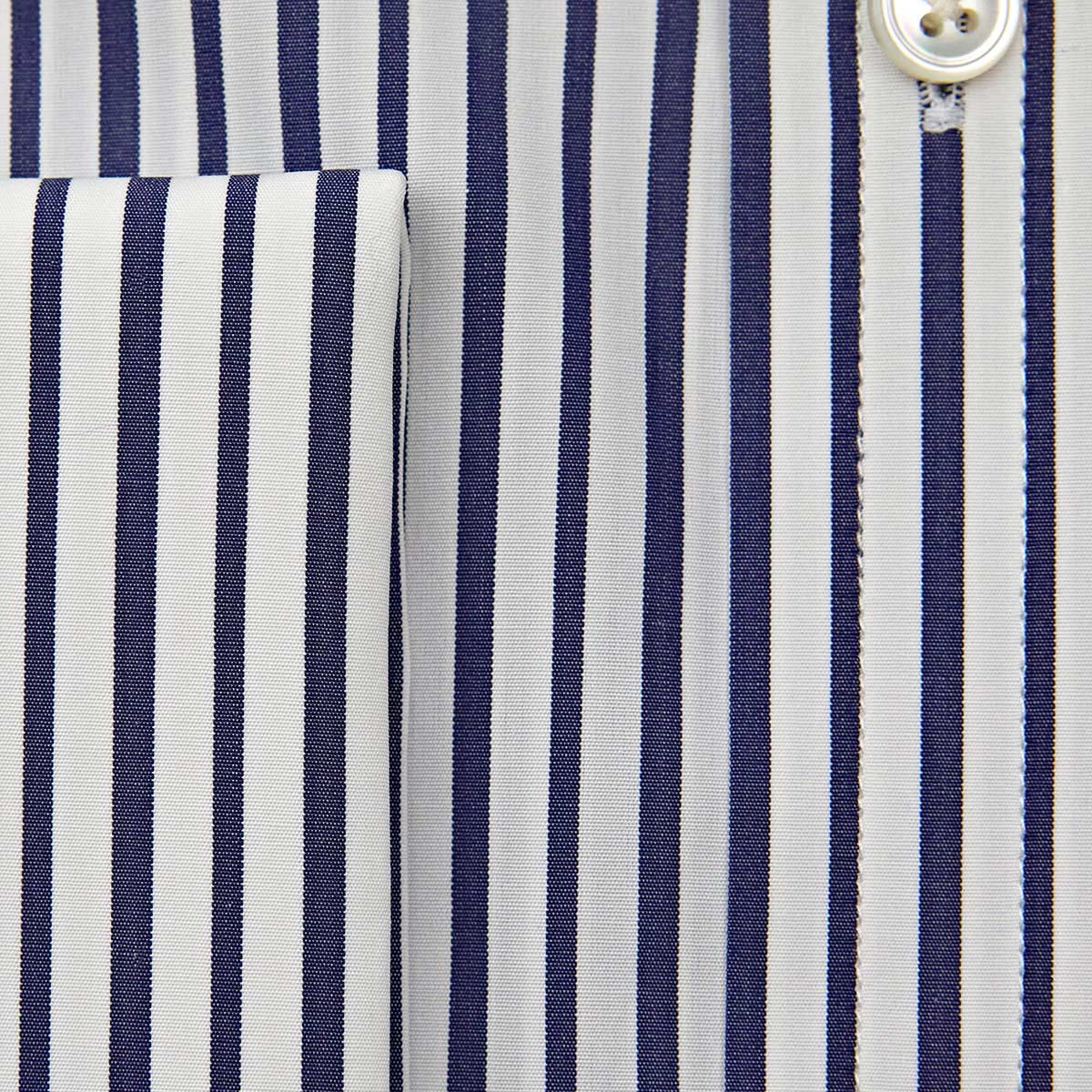 A timeless wardrobe essential, this classic fit shirt showcases a striking navy candy stripe pattern woven into premium cotton poplin. The refined classic collar and double cuff provide sophisticated structure, while the meticulous tailoring ensures a polished silhouette suitable for both professional and formal occasions. The breathable cotton construction offers comfort throughout the day, making this versatile piece an investment in enduring style.
