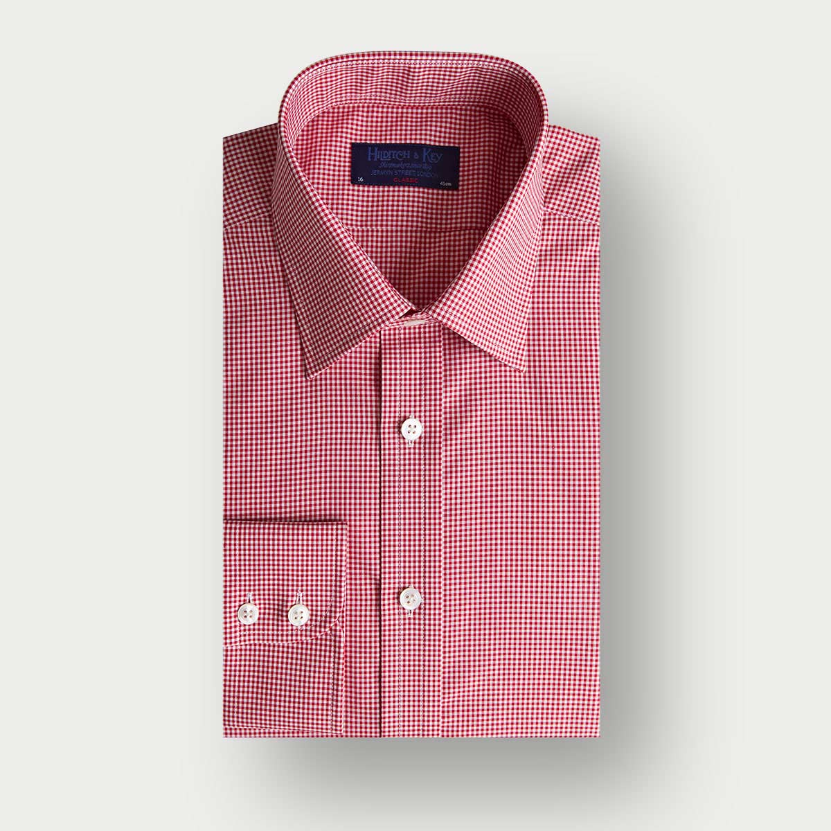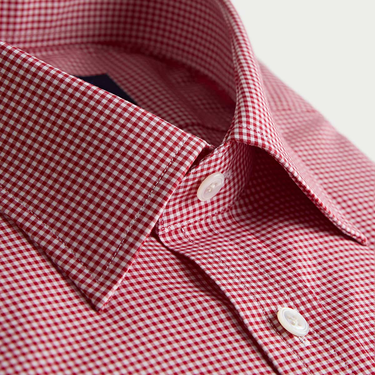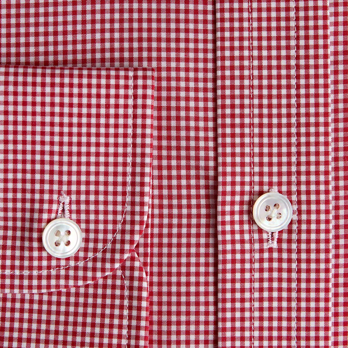 This classic fit shirt features a red small gingham check pattern crafted from breathable cotton poplin. Designed with a timeless classic collar and two-button cuffs, it offers a polished look perfect for layering under cashmere. The pattern is carefully matched for a seamless appearance, and mother of pearl buttons add a refined finishing touch. Ideal for everyday elegance with a comfortable fit.