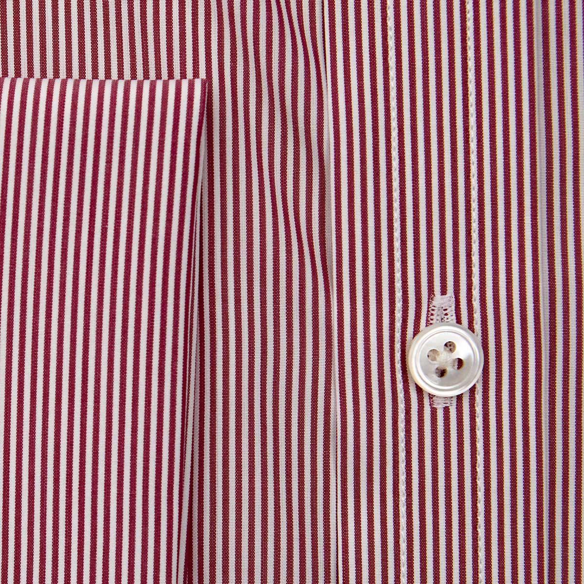 Elevate your formal wardrobe with this contemporary fit shirt, crafted from luxurious Sea Island quality cotton renowned for its exceptional softness and durability. The refined burgundy Bengal stripe pattern is meticulously pattern-matched throughout, creating a cohesive visual flow. Finished with a classic collar and double cuff, this piece pairs effortlessly with tailored suit jackets for boardroom sophistication. Mother of pearl buttons and exquisite detailing throughout underscore the shirt's premium construction, making it an investment in timeless elegance.
