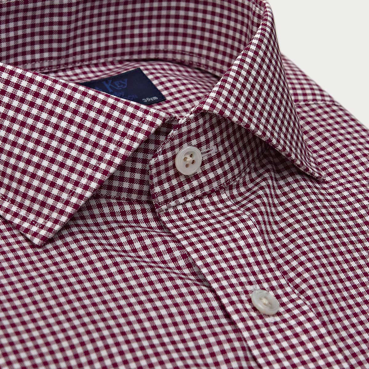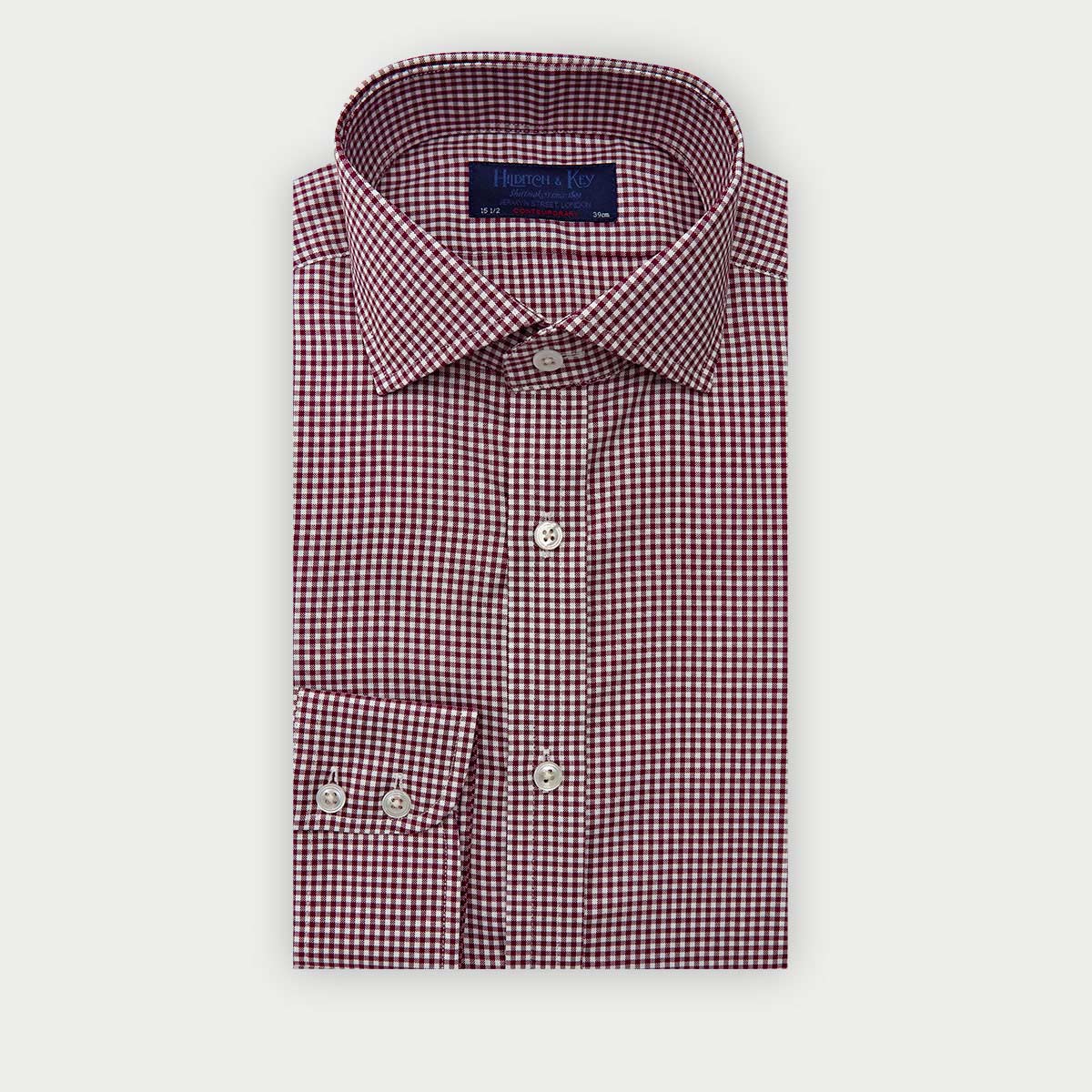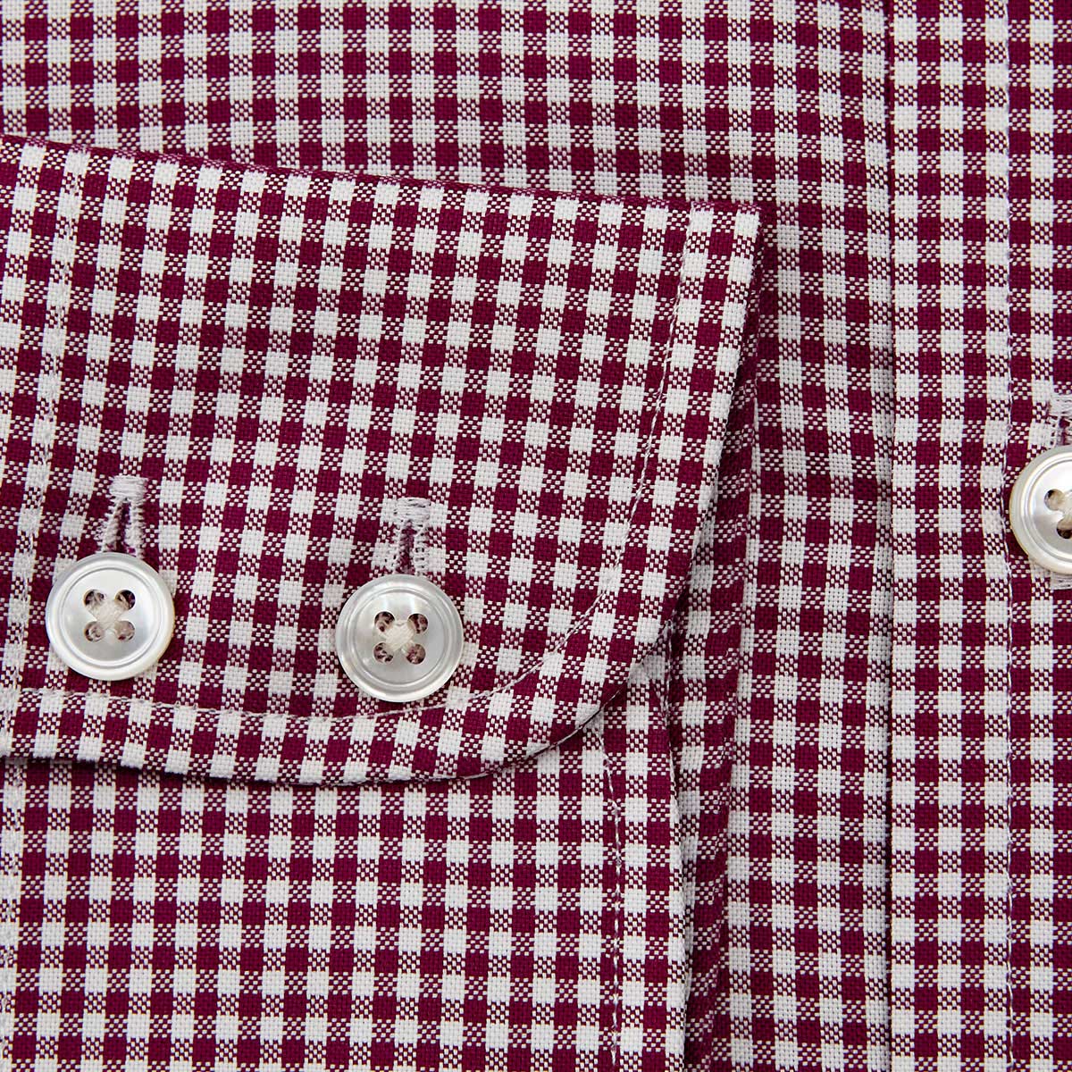 Contemporary Fit Burgundy Gingham Check Oxford Cotton Shirt with Cut-Away Collar & Two Button Cuff