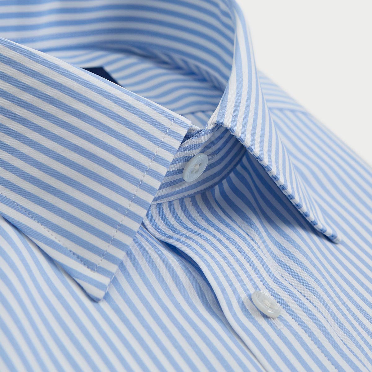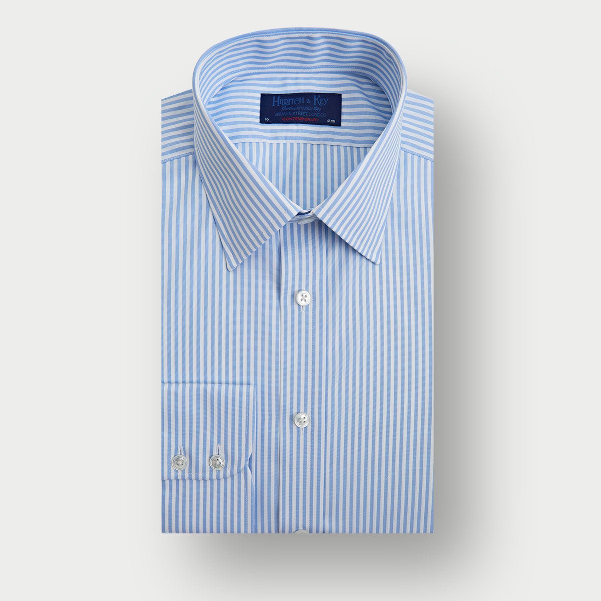 This light blue Bengal stripe shirt features a contemporary fit and is crafted from soft cotton poplin for all-day comfort. It has a classic collar and two-button cuffs, finished with elegant mother of pearl buttons. Perfect for adding a fresh, stylish touch to your everyday look.