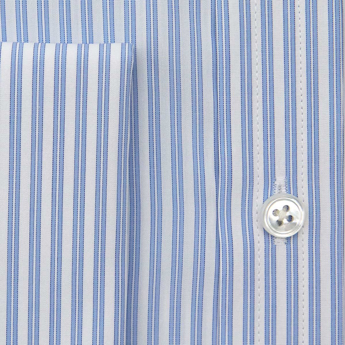 Crafted from exquisite Sea Island quality cotton, this contemporary fit shirt exemplifies refined tailoring. The light blue double stripe pattern is meticulously pattern-matched throughout, ensuring visual harmony across seams and plackets. Classic collar and double cuff construction provide timeless elegance, whilst mother of pearl buttons add a subtle luxury touch. Designed for the discerning professional, this shirt delivers the perfect balance of comfort and sophistication for any business setting.