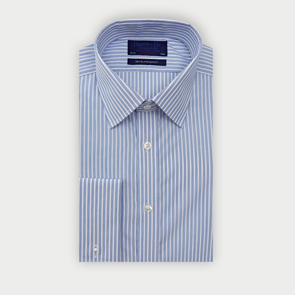 Contemporary Fit Light Blue Double Stripe Sea Island Quality Cotton Shirt with Classic Collar & Double Cuff