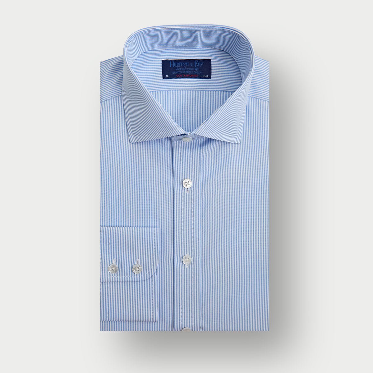 This Contemporary Fit shirt features a light blue fine Bengal stripe pattern crafted from soft cotton for all-day comfort. Its stylish cut-away collar and two-button cuff add a modern touch, while mother of pearl buttons provide subtle elegance. Perfect for both work and casual occasions, this shirt combines classic design with a fresh, approachable look.