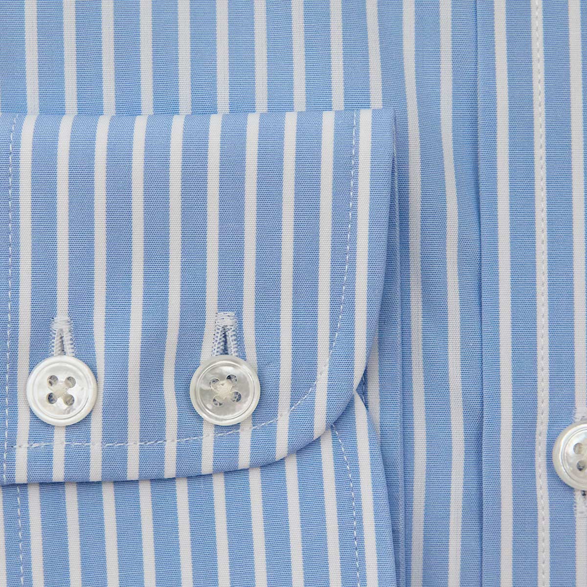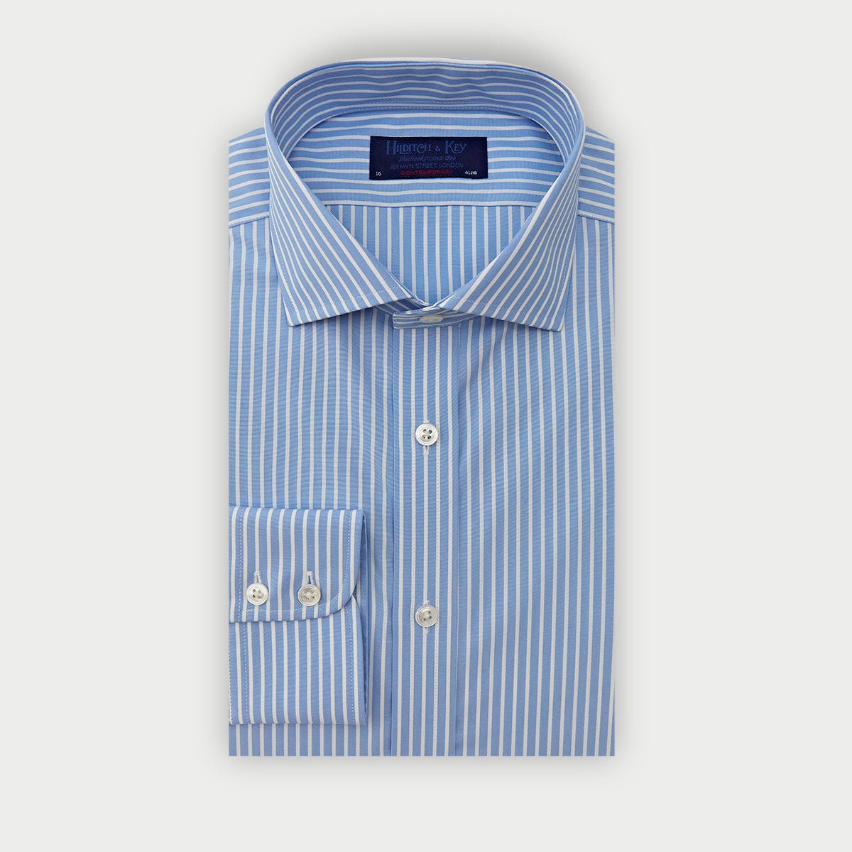 This contemporary cut shirt combines understated elegance with practical sophistication. The crisp light blue and white stripe pattern offers versatility across professional and smart-casual settings, whilst the cut-away collar frames the face flatteringly and accommodates a wider range of neckties. Crafted from pure cotton, the fabric delivers breathability and a refined drape that improves with wear. Mother-of-pearl buttons add a subtle luxury touch, and the two-button cuff provides a polished finish. A timeless design that transcends seasonal trends, this shirt forms the foundation of any discerning wardrobe.