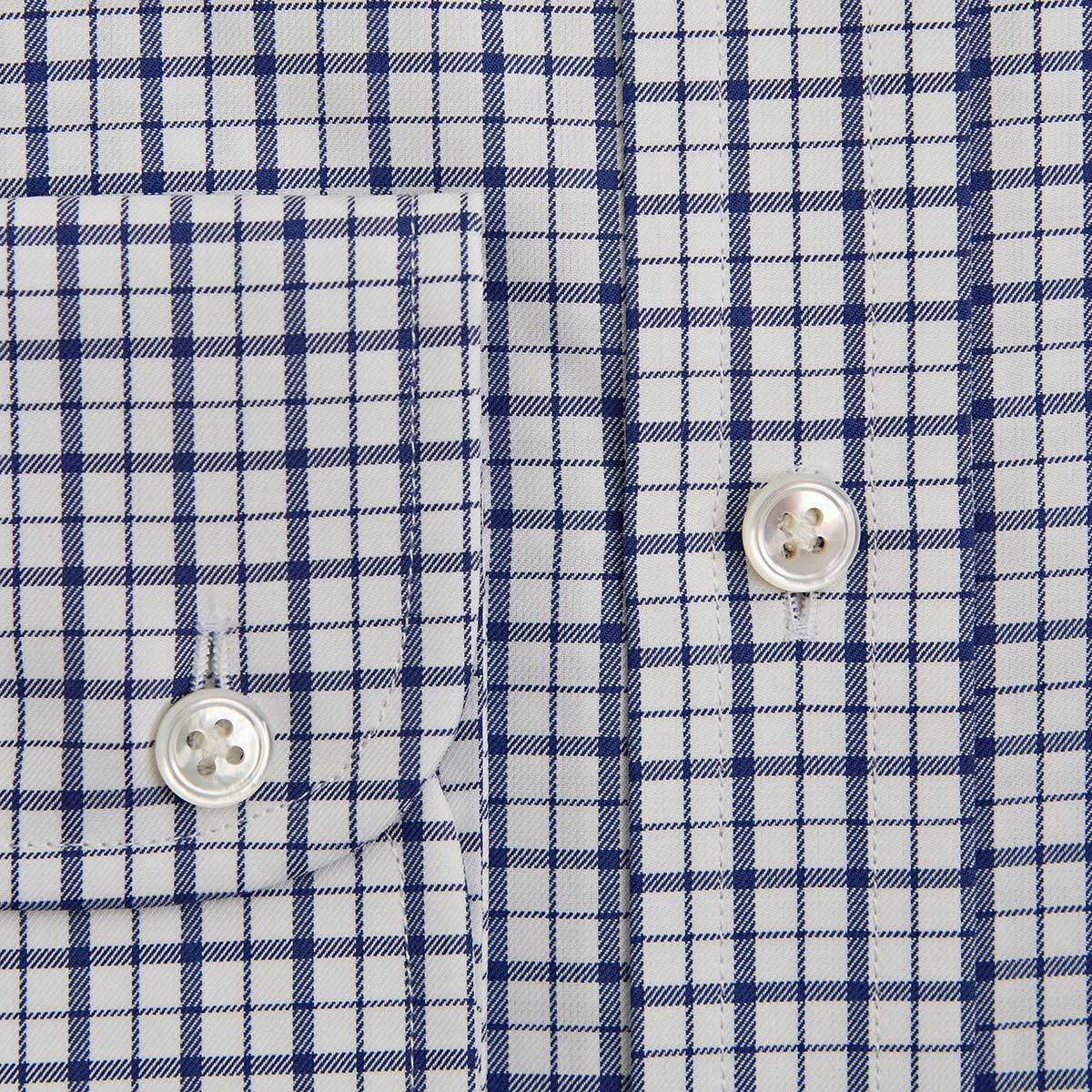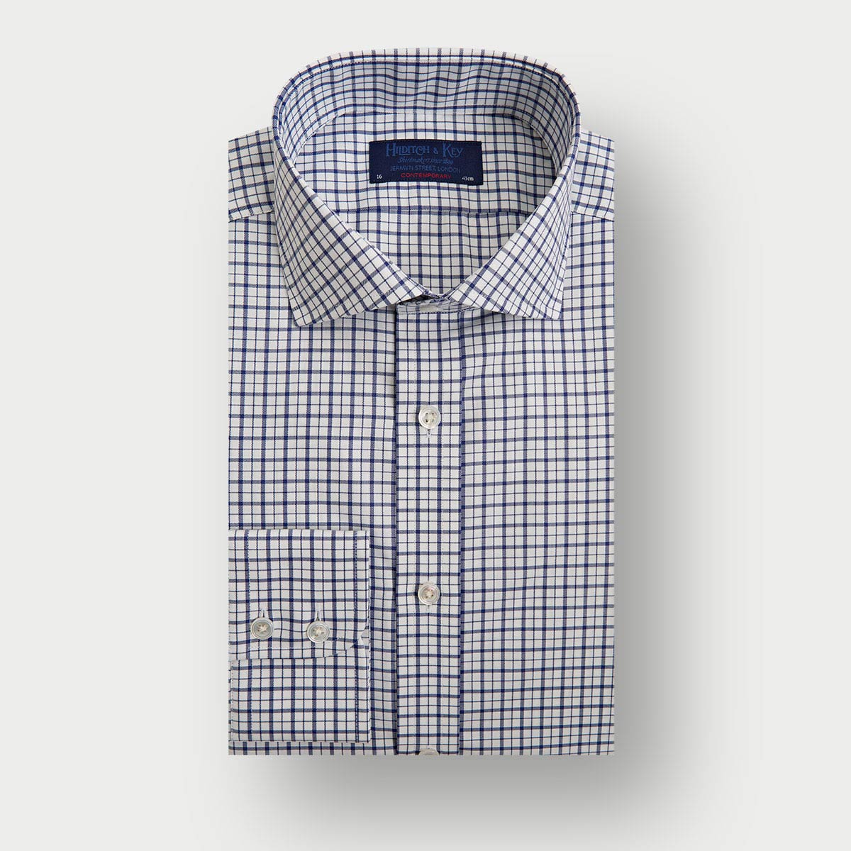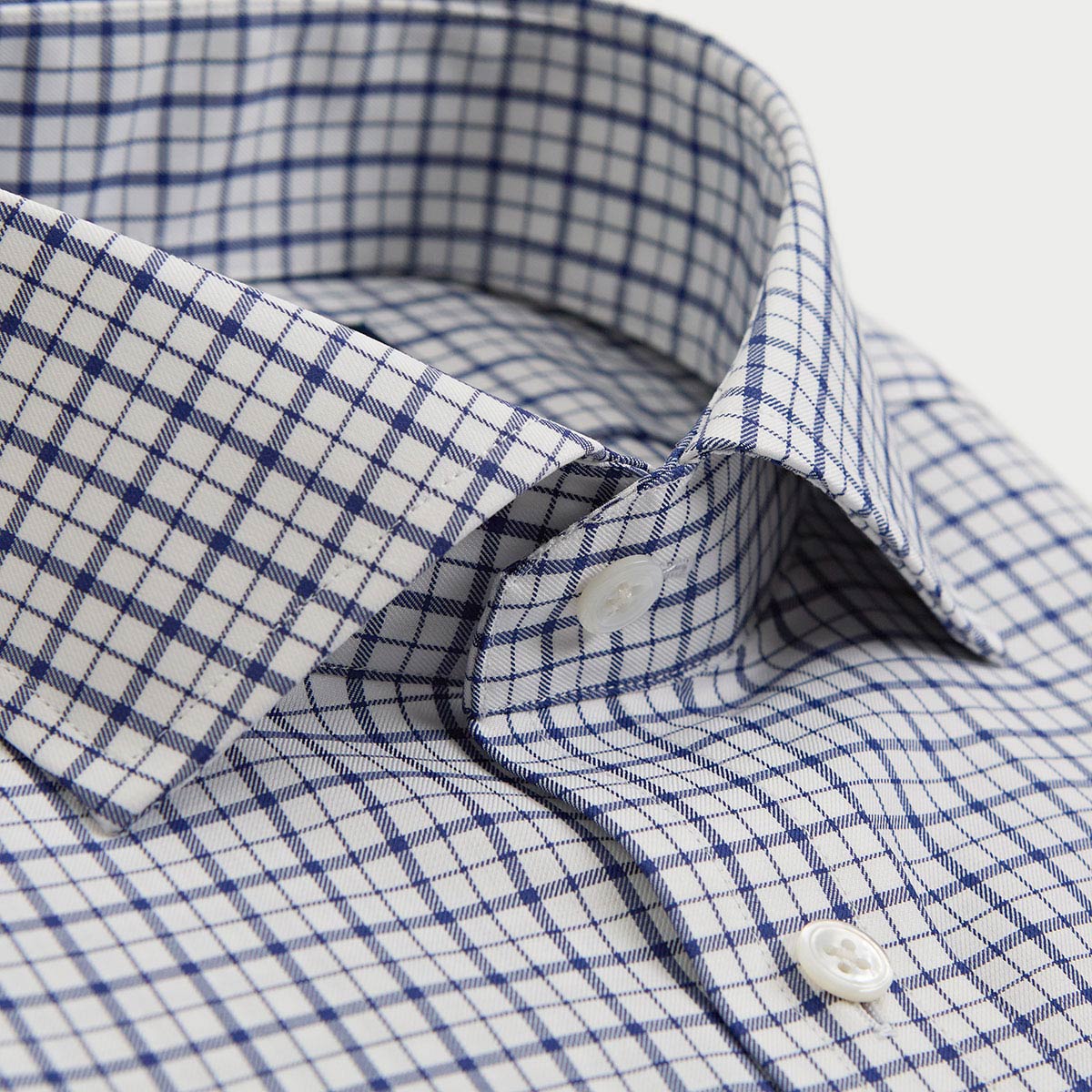 Contemporary Fit Navy Double Check Cotton Twill Shirt with Cut-Away Collar & Two Button Cuff