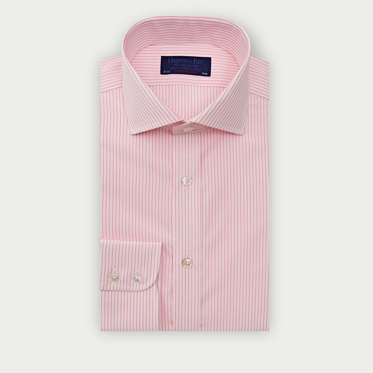 Elevate your wardrobe with this sophisticated pink pinstripe cotton shirt, expertly crafted for the modern gentleman. The contemporary fit provides a refined silhouette without compromising comfort, whilst the distinctive cut-away collar frames the face elegantly and pairs seamlessly with ties or worn open. Lustrous mother of pearl buttons add a touch of understated luxury, and the two-button cuff ensures a polished finish. Meticulous pattern matching throughout demonstrates the quality craftsmanship Hilditch & Key is renowned for. Perfect for both professional settings and smart casual occasions.