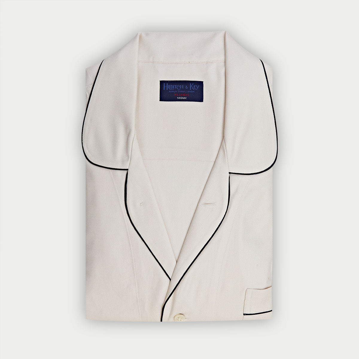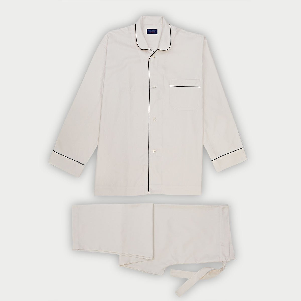 Indulge in timeless comfort with these cream twill cotton pyjamas, elevated by refined navy piping detailing. Crafted from premium cotton twill, they offer a subtle lustre and structured drape that distinguishes them from everyday sleepwear. Features include mother of pearl buttons for an understated touch of elegance, a practical open fly, and drawstring bottoms for a customisable fit. The sophisticated colour palette and meticulous finishing make these an essential addition to any discerning wardrobe, perfect for restful nights and leisurely mornings alike.