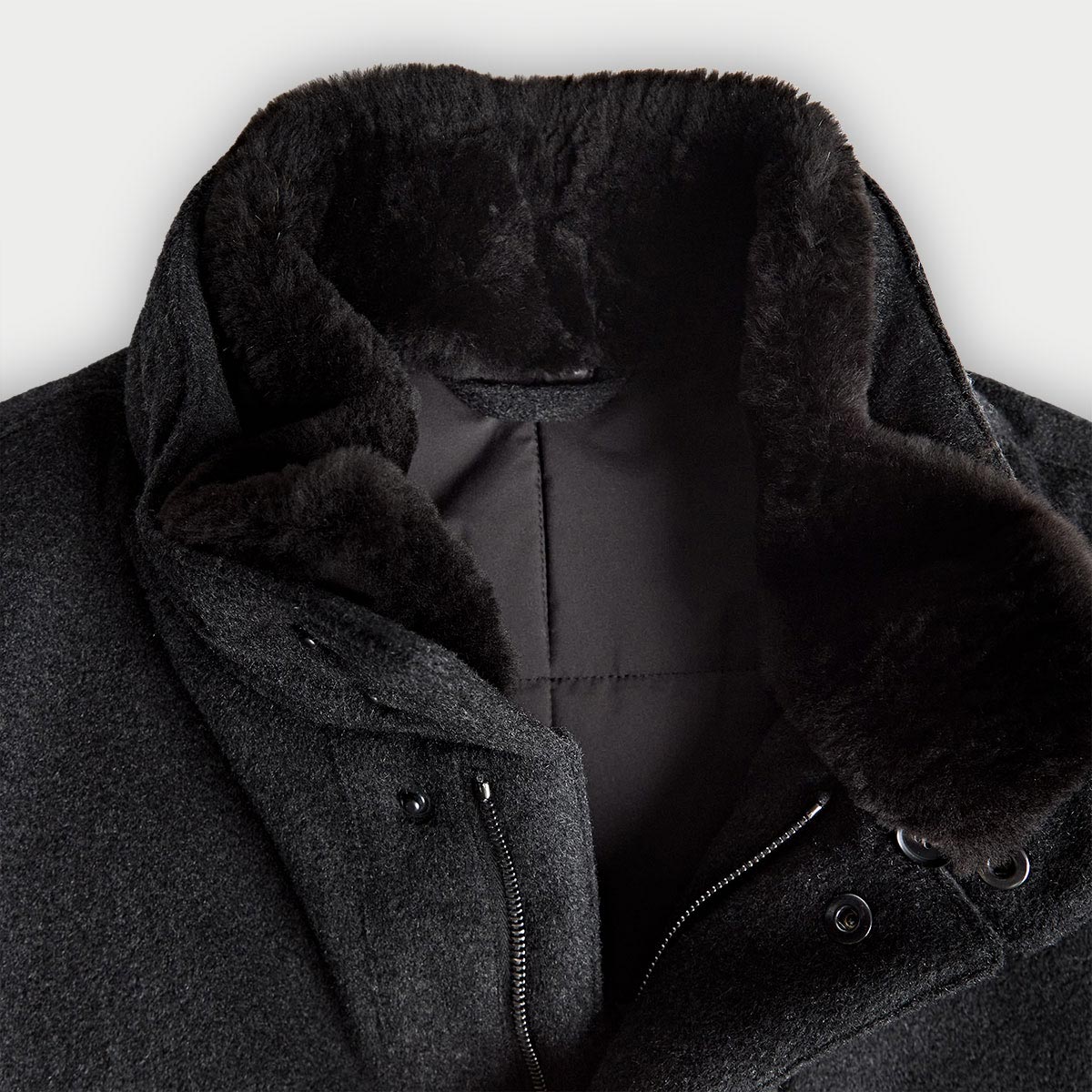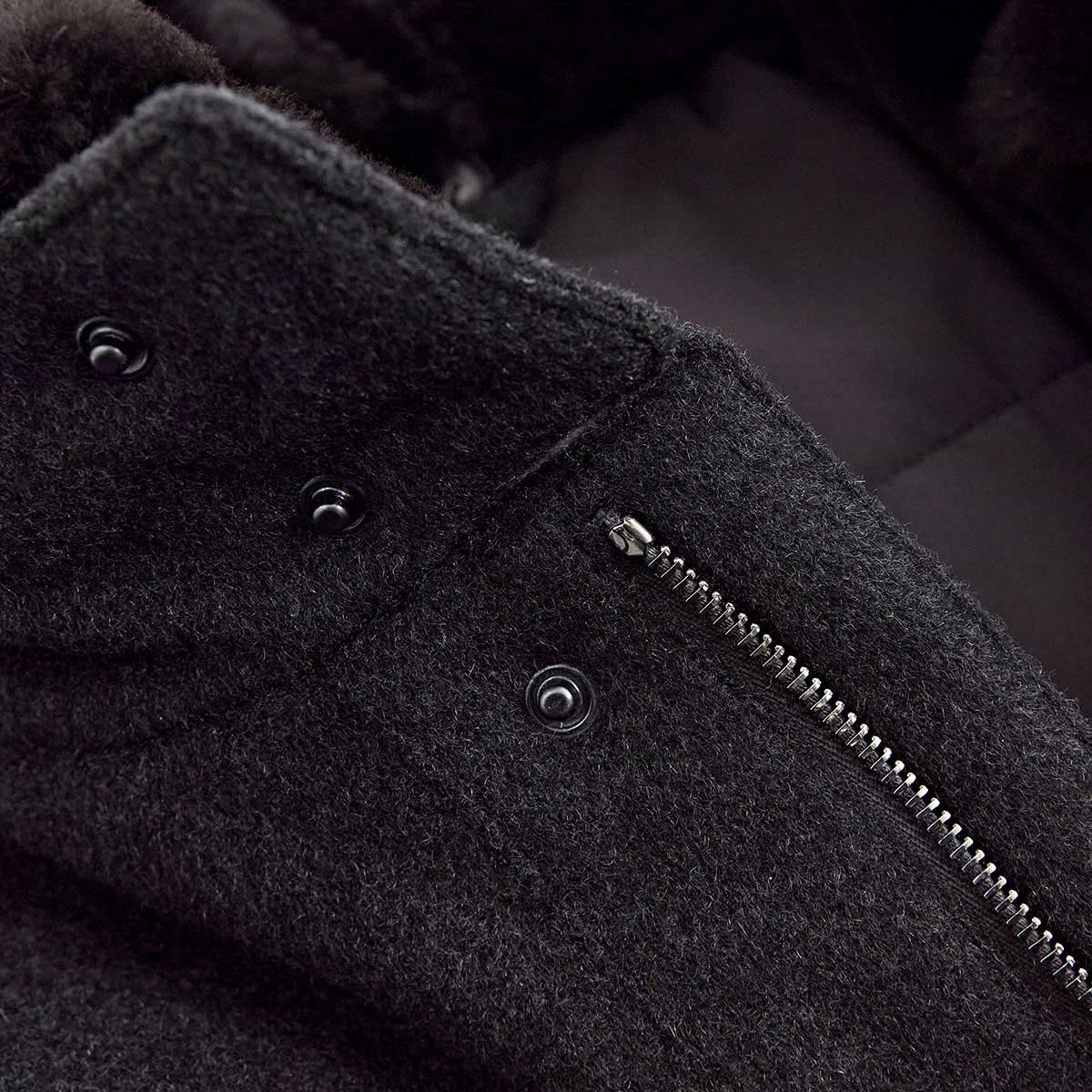 The Connor coat in dark grey showcases exceptional craftsmanship through its marriage of advanced materials and thoughtful design. Constructed from Loro Piana's Green Storm System technology combined with luxurious 100% cashmere, this coat provides superior insulation and weather protection with refined comfort. The detachable beaver fur collar grants styling versatility whilst maintaining understated elegance, and the concealed hood delivers practical shelter without compromising the coat's polished silhouette. Reinforced stitching throughout demonstrates meticulous attention to construction quality, ensuring this investment piece withstands years of discerning wear.
