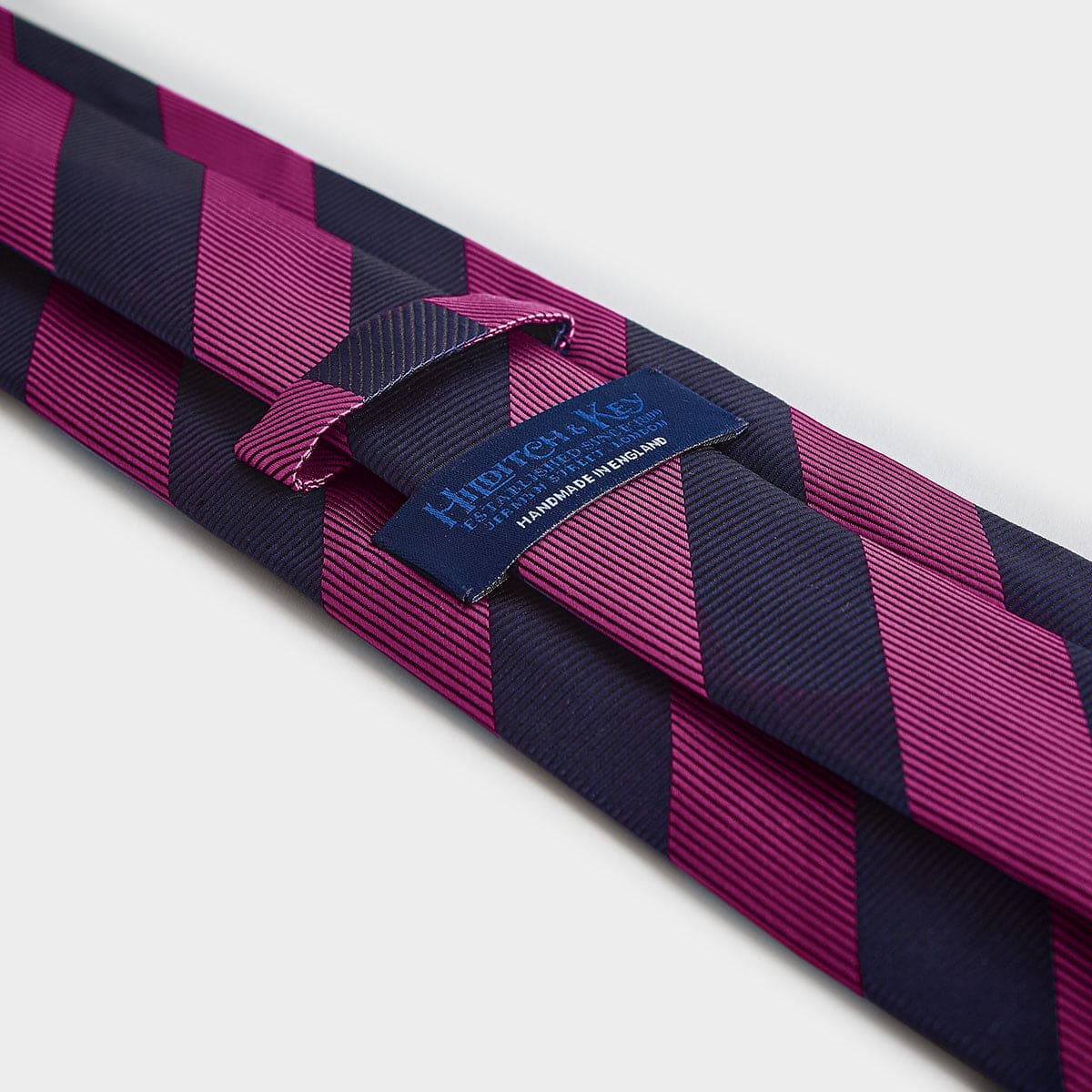 Elevate your style with our Fuchsia & Navy Block Stripe Silk Tie. Handcrafted in England using traditional techniques, this luxurious tie features a vibrant block stripe design. Made with 100% woven silk, it is self tipped for a classic touch. Stand out from the crowd with this timeless and elegant accessory.