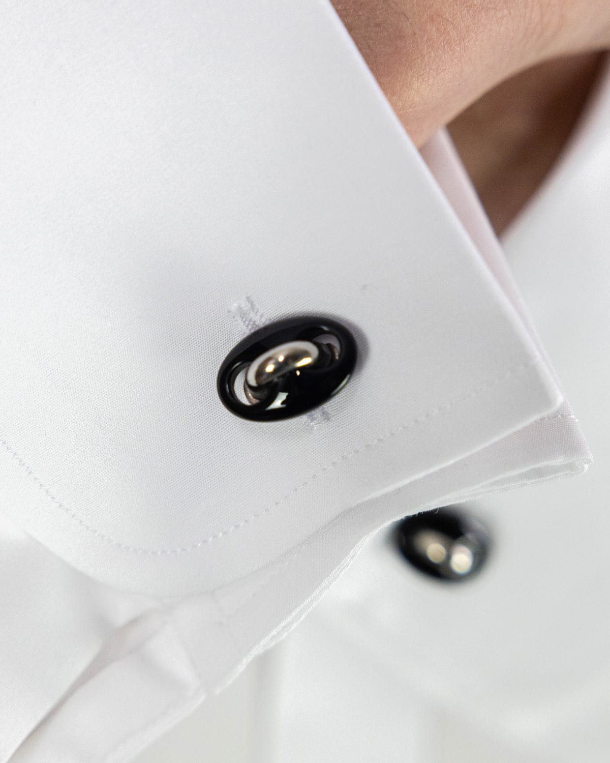 British jewellery house Longmire creates cufflinks designed to be noticed. This sleek design features black onyx with a link of silver woven through. Make a quiet statement on your shirt cuffs.