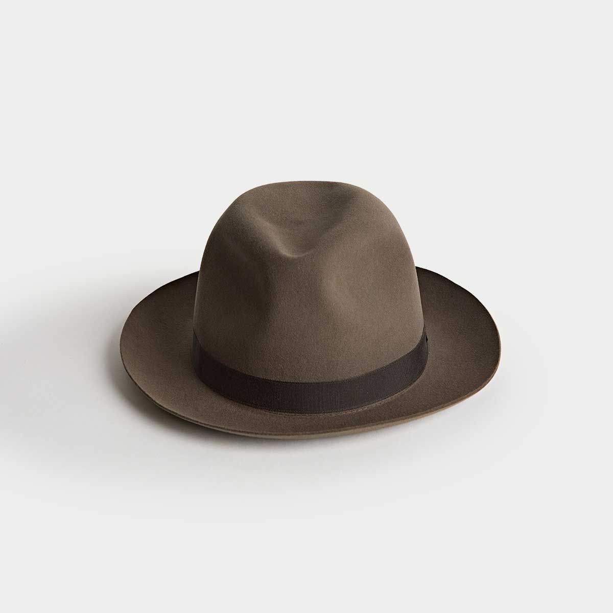 The classic trilby hat gets its name from the 1894 novel by George du Maurier entitled ‘Trilby’; when the book was adapted for the London stage, the distinctive hat worn by the lead character attracted such attention from the well-heeled of high society that its name was born. The style is distinctive yet less dramatic than the fedora, designed for easy daily use. This distinguished version in rabbit fur felt comes with a white satin lining and neat ribbon.