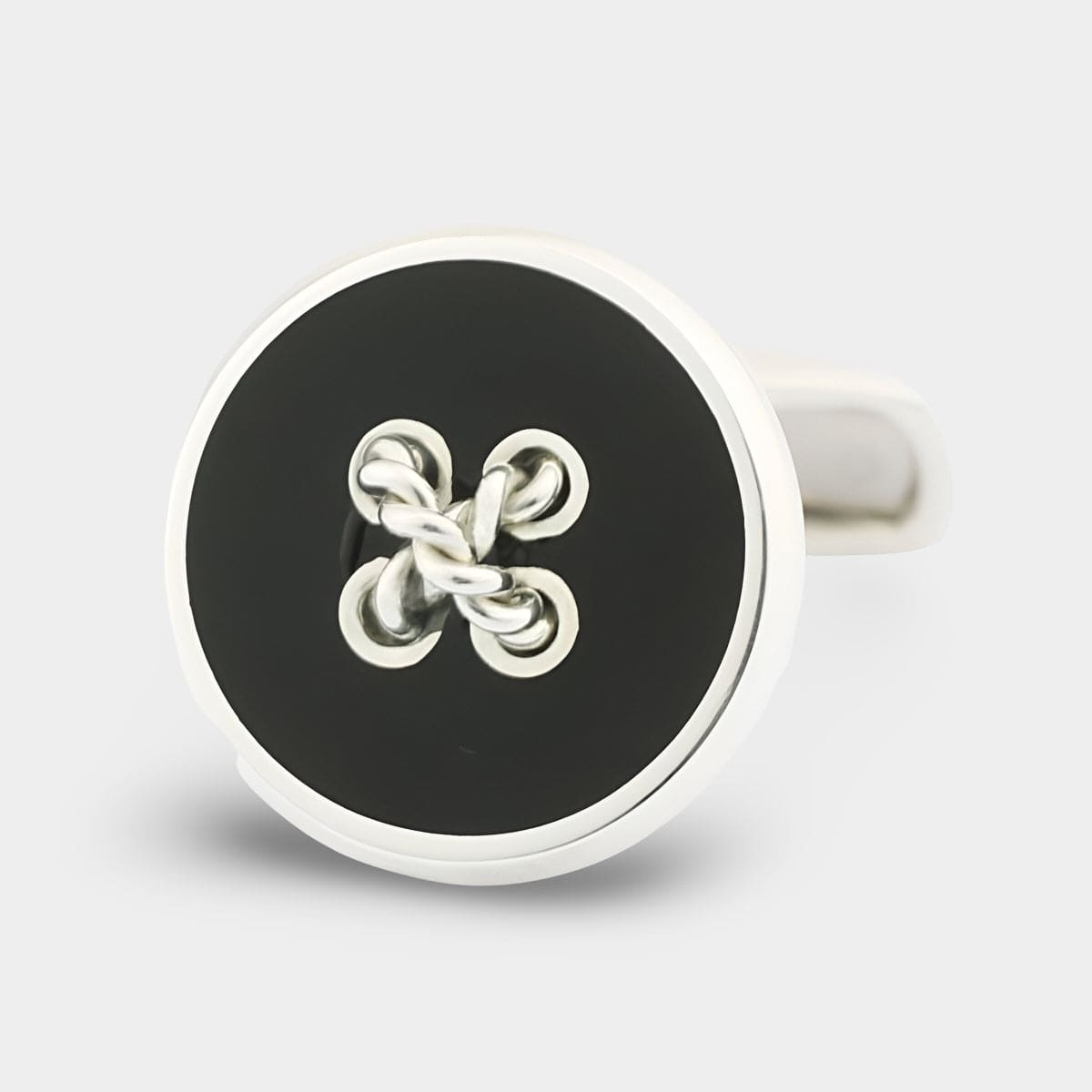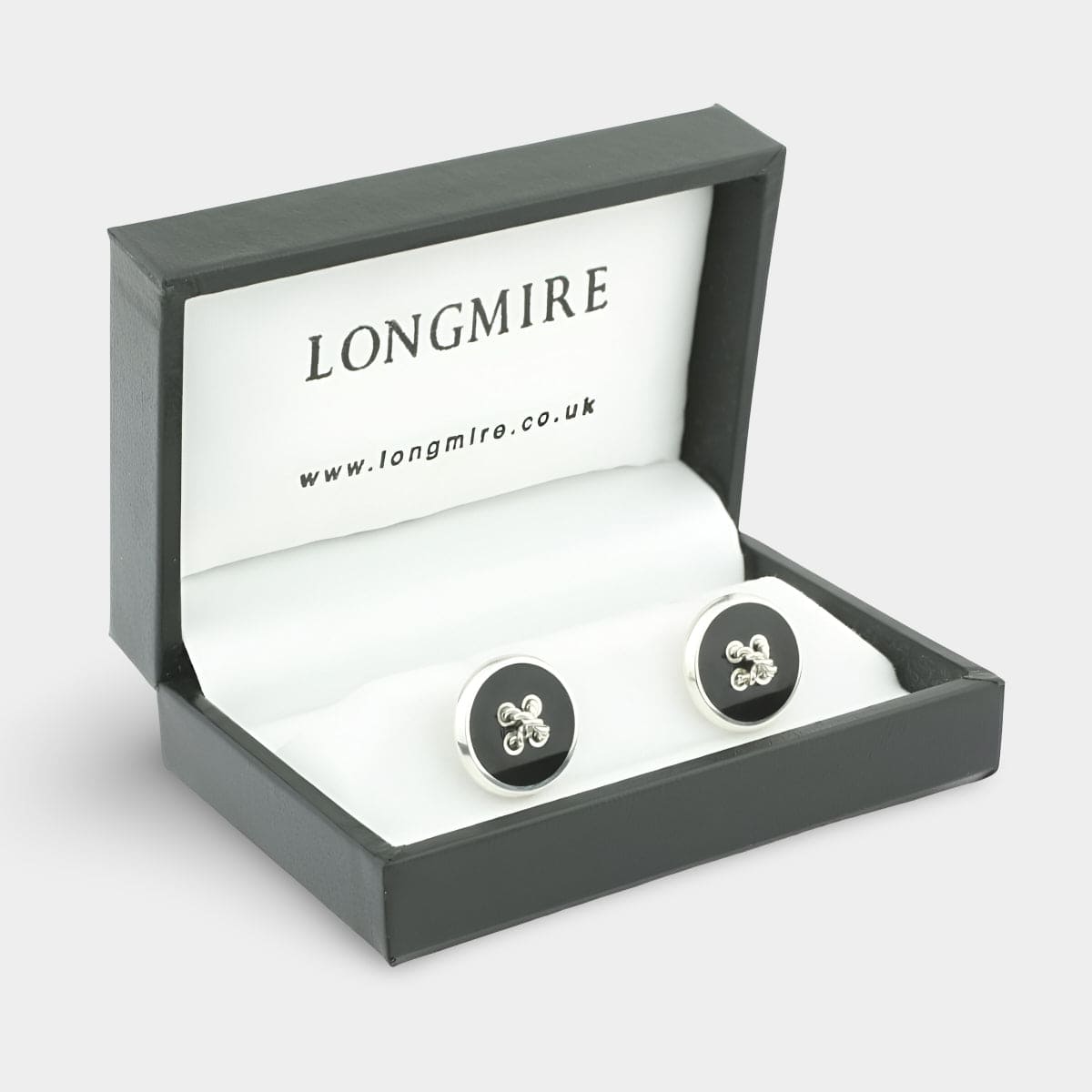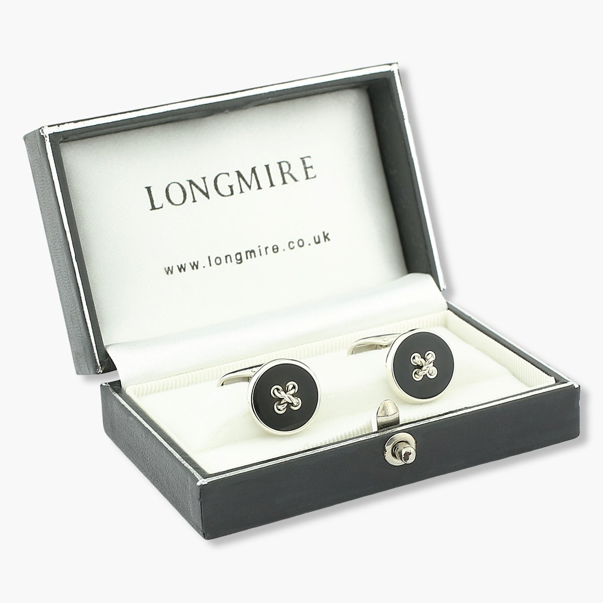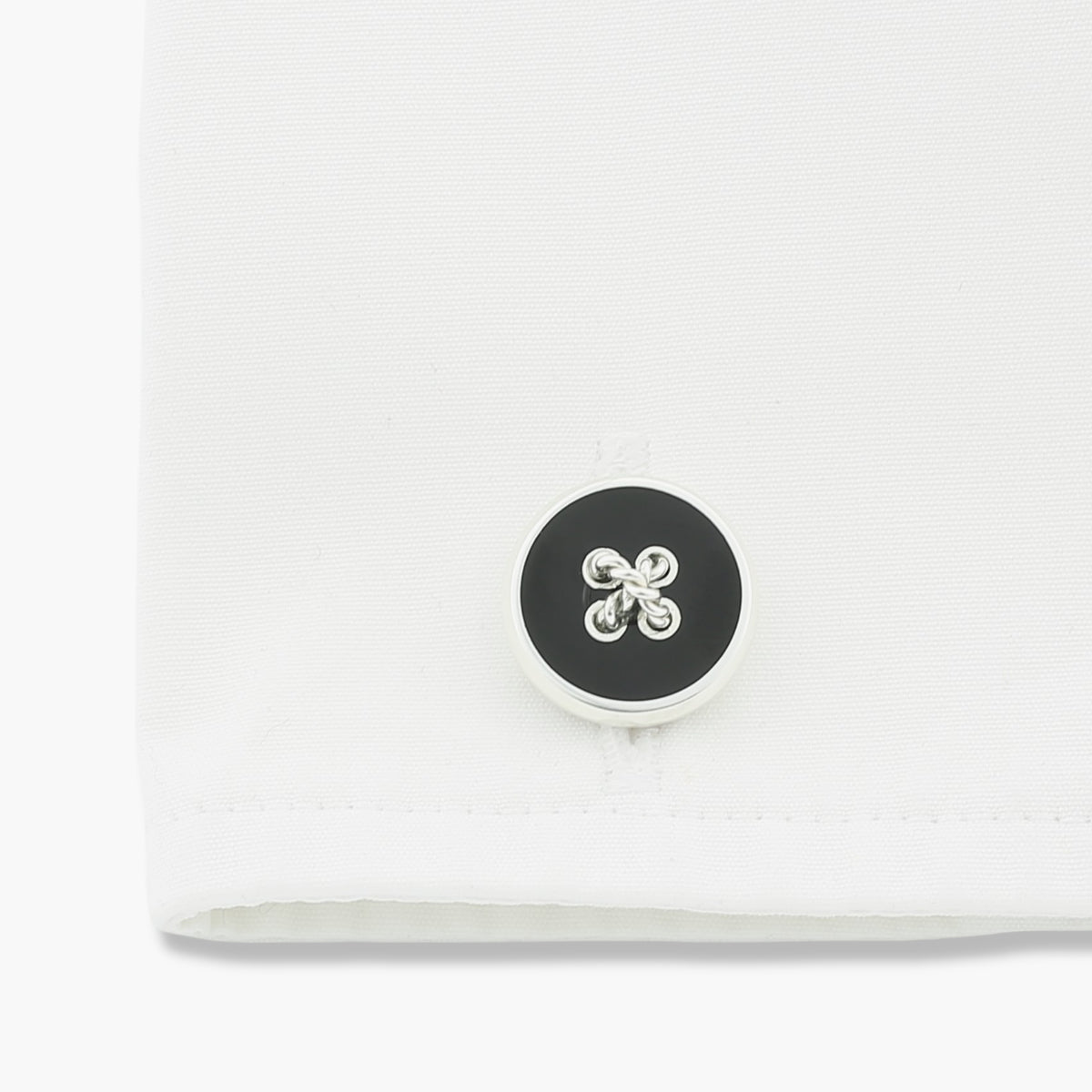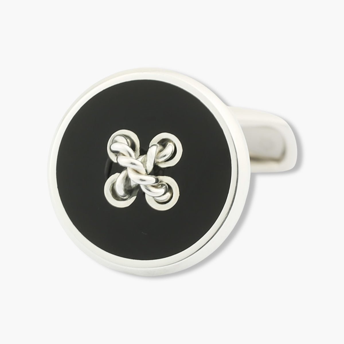 Longmire's button cufflink designs are timeless classics and surely, must be included in every aficionado's collection. Here, set on hallmarked sterling silver and featuring T-bar connectors, the dark onyx strikes a pose in a classical, stylish fashion. The intricate 'stitching' in the centre sets this classic apart.
