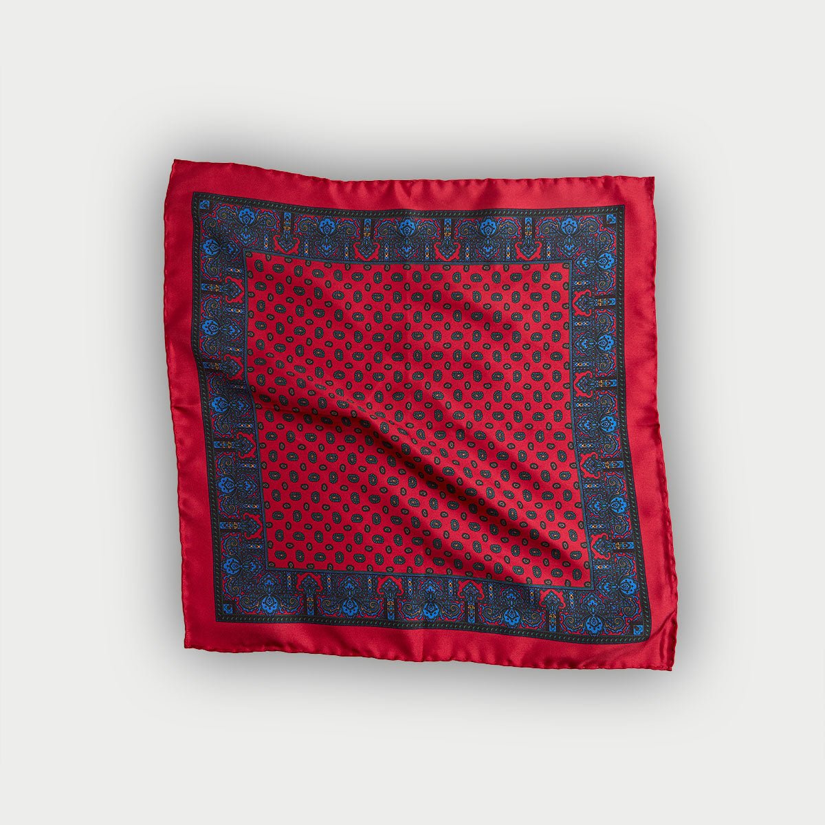Enhance your wardrobe with the Red Paisley Bean Motif Silk Pocket Square, expertly made in England from 100% pure silk. Its hand-rolled edges provide a polished finish, while the classic bean design offers a subtle yet timeless elegance. Ideal for adding a sophisticated accent to any blazer or suit, this pocket square exemplifies fine craftsmanship and enduring style.