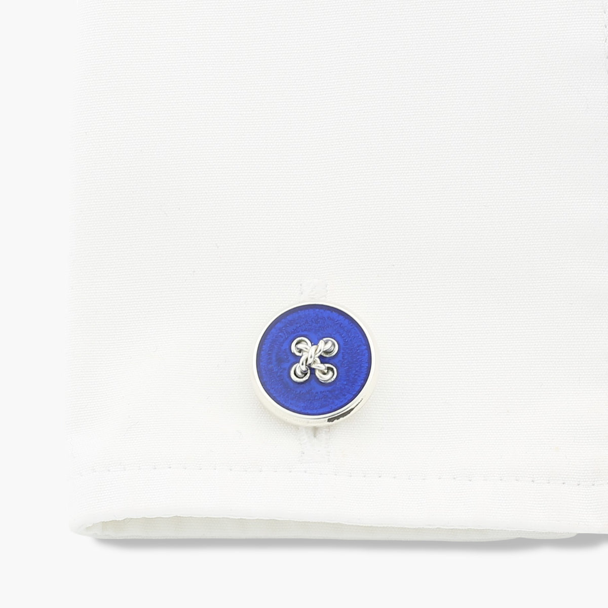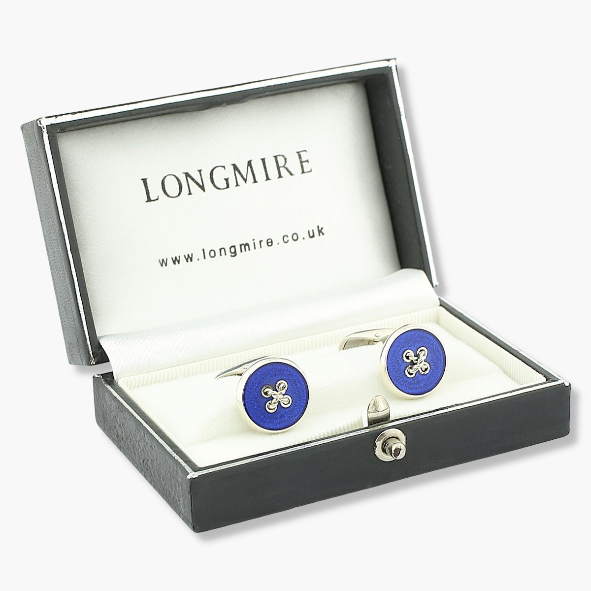 Longmire's button cufflink designs are timeless classics and surely, must be included in every aficionado's collection. Here, set on hallmarked sterling silver featuring T-bar connectors, the hand enamelled royal blue catches the eye instantly. The intricate 'stitching' in the centre sets this classic apart.