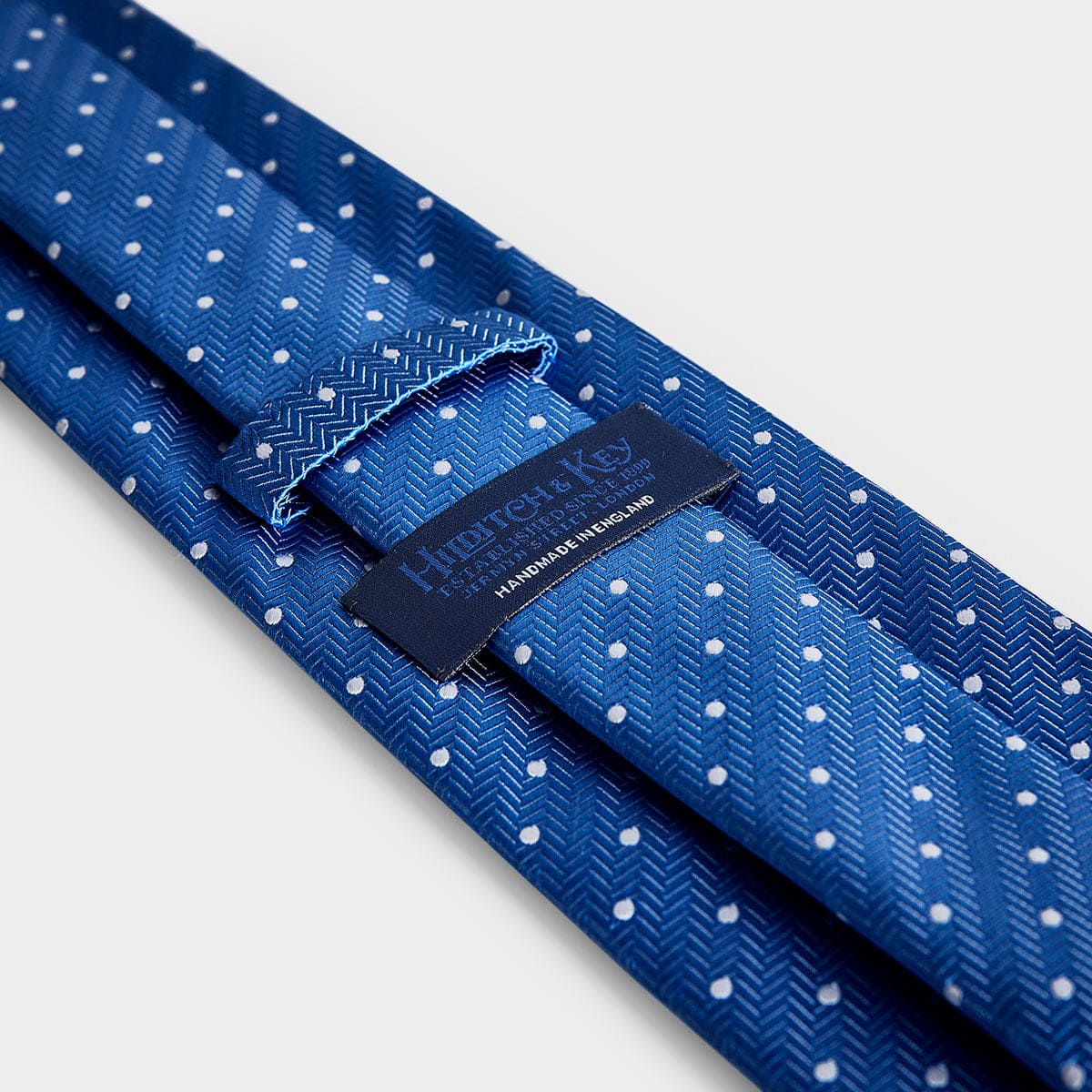 Elevate your style with our Royal Blue & White Spot Herringbone Silk Tie. Made in England and crafted by hand from woven silk, this tie exudes sophistication. With a classic spot design and self-tipped finish, it's versatile and the perfect accessory for all occasions.
