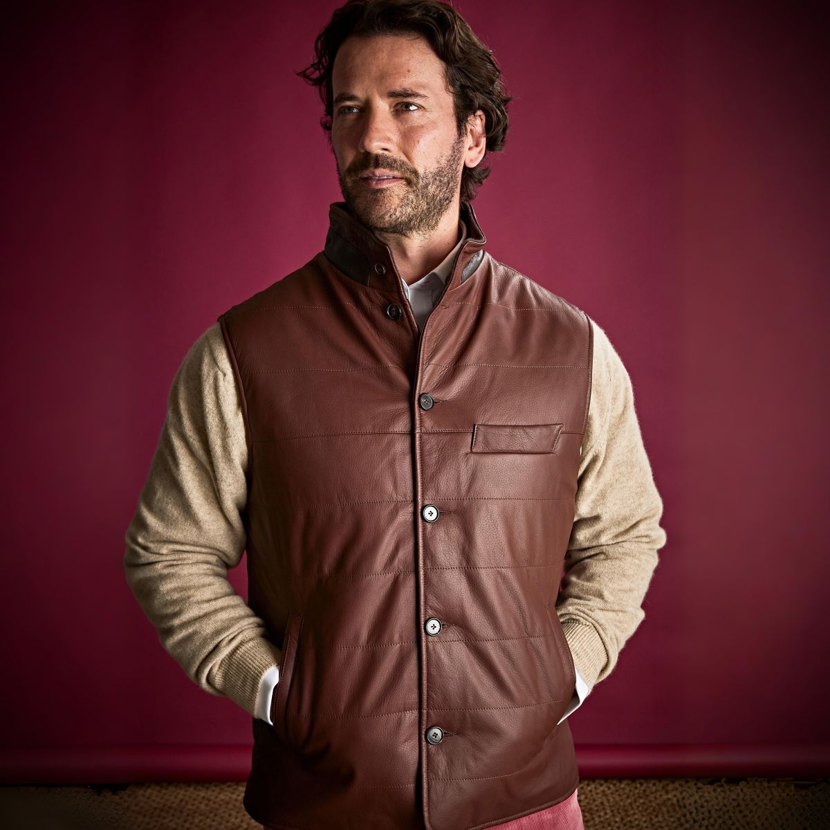 The last word in discreet luxury, this buttery-soft gilet is crafted from deerskin leather, ethically sourced from Northern Europe, and designed with exceptional care and craftsmanship. Padded for a sense of solidity and warmth, it’s fully lined and features horn buttons. Up the ante at après ski or elevate your weekend look in the countryside with this handsome piece.